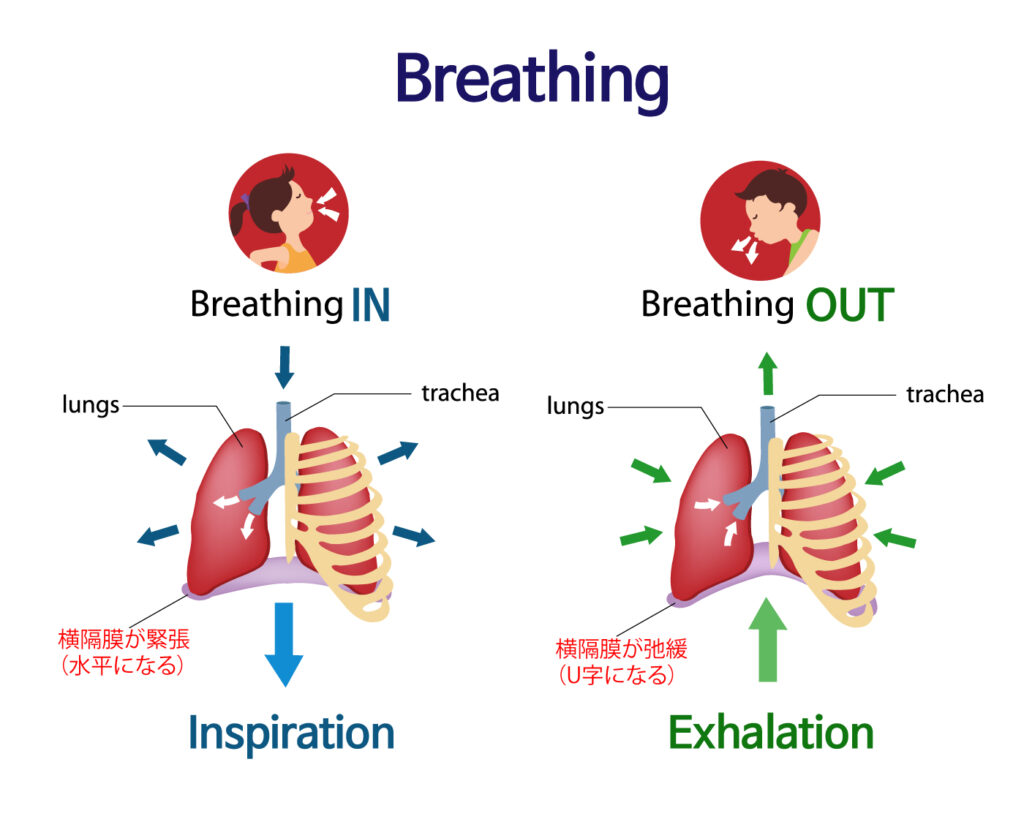 参考程度に、解剖学的に見た場合の呼吸運動の図もはっておきますね。呼吸自体は「横隔膜の上下運動」が主動です。